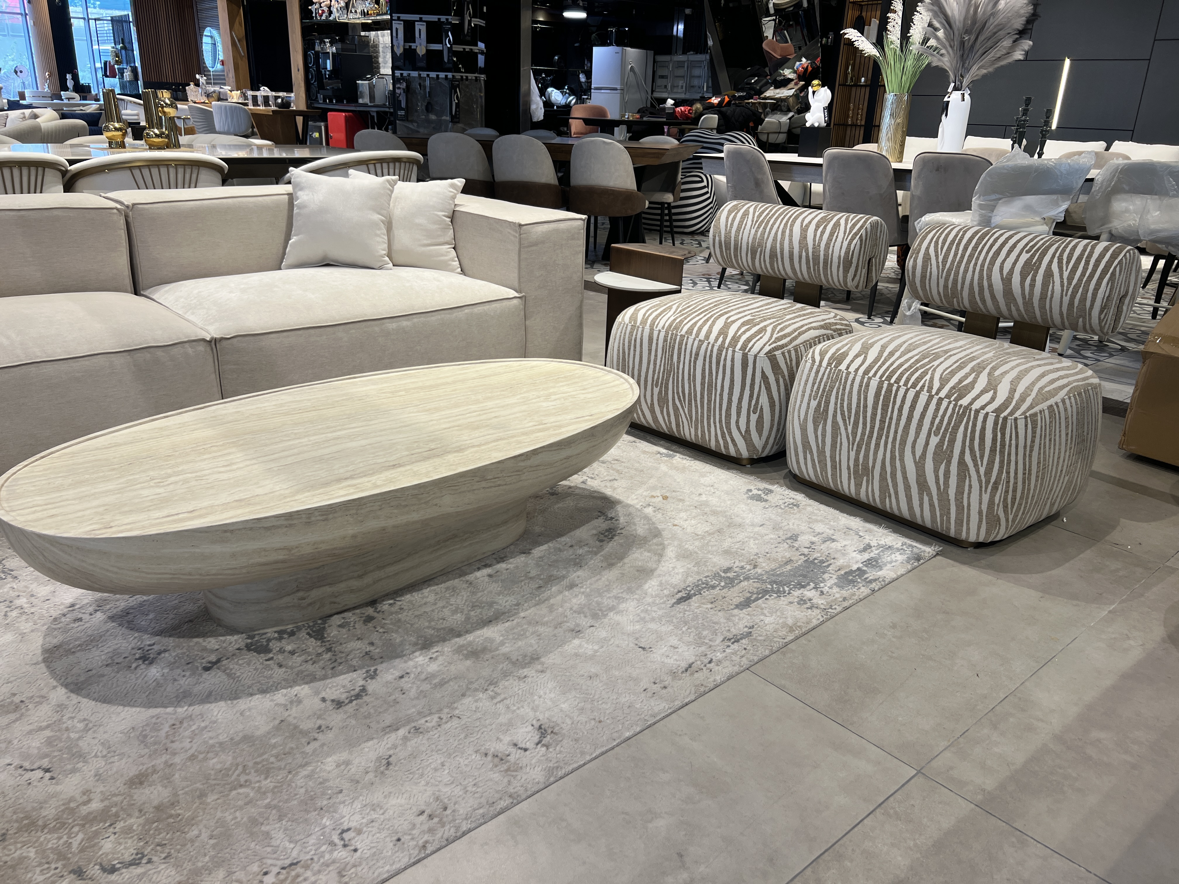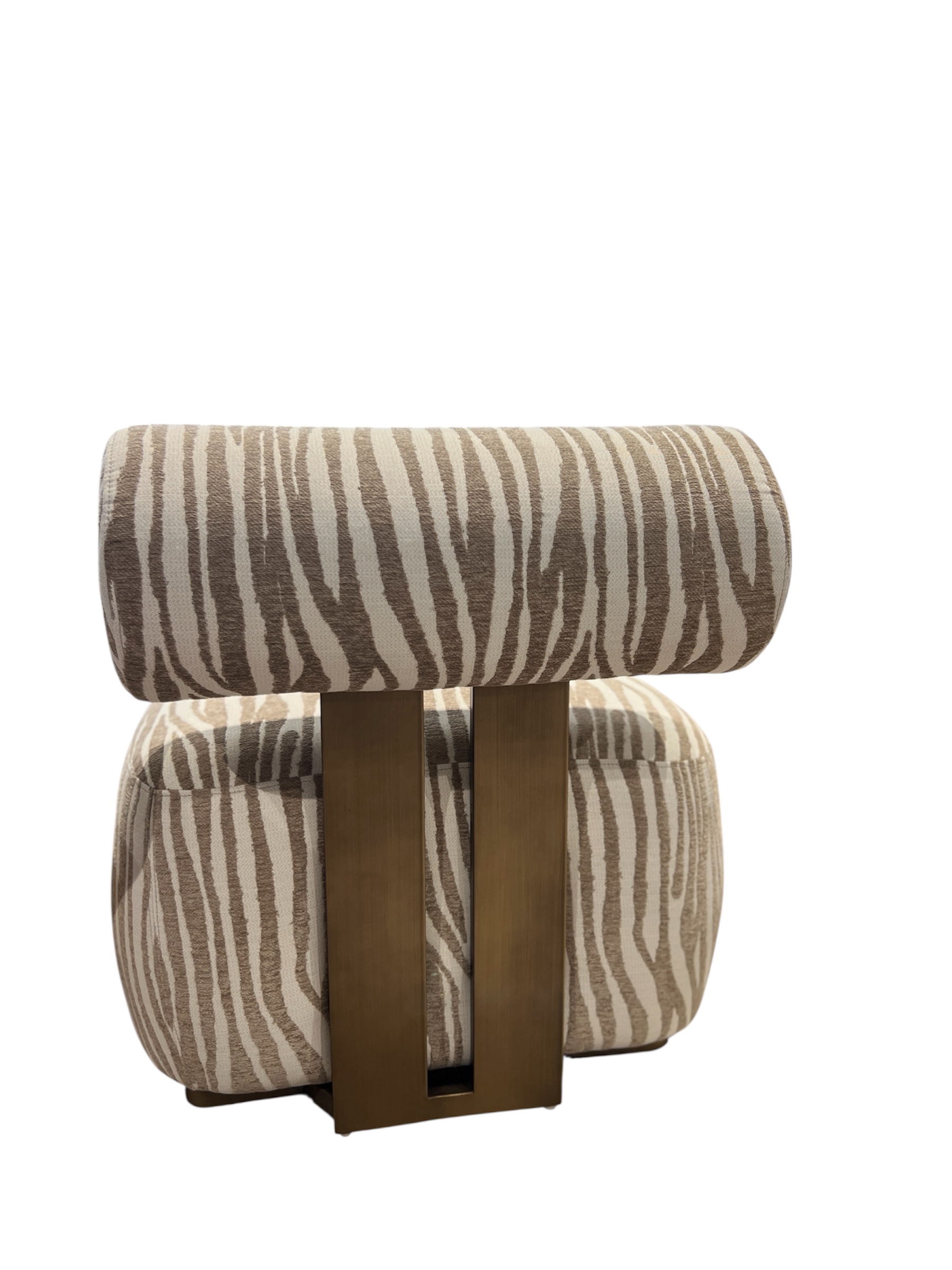 הכורסא מרופדת בבד איכותי בדוגמה אורגנית בגווני בז ושמנת, המעניקה עומק וטקסטורה עשירה .