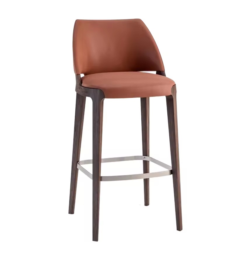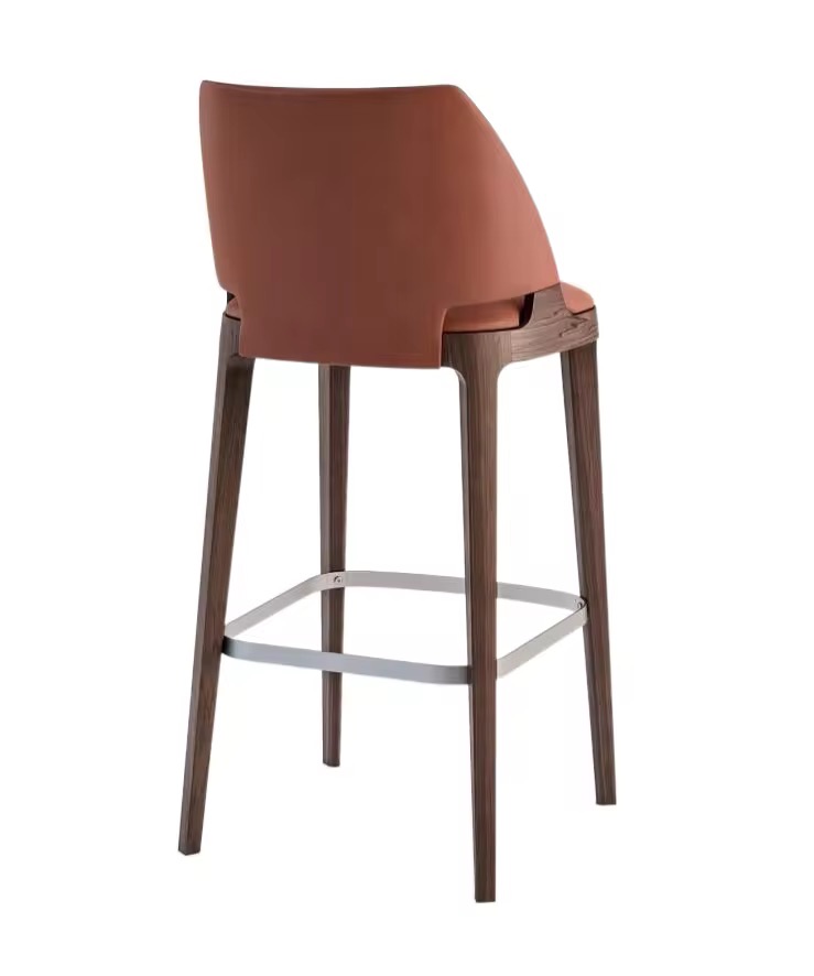 כיסא בר בעיצוב מודרני בקווים נקיים ומדוייקים. משענת הגב האלכסונית יוצרת מראה ייחודי ודינמי, תוך מתן תמיכה נוחה לישיבה ממושכת. המושב והגב מרופדים בריפוד איכותי בגוון חום עמוק, המשתלב בהרמוניה עם שלדת העץ הכהה.